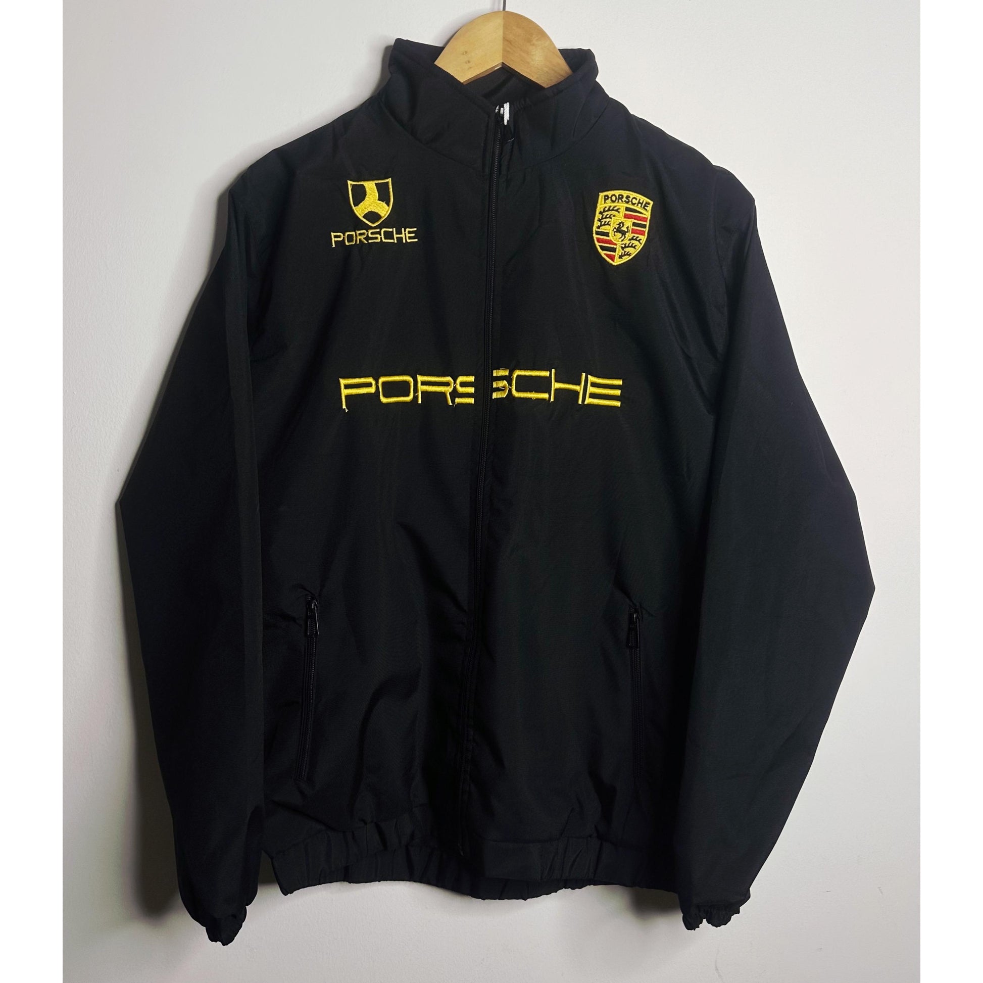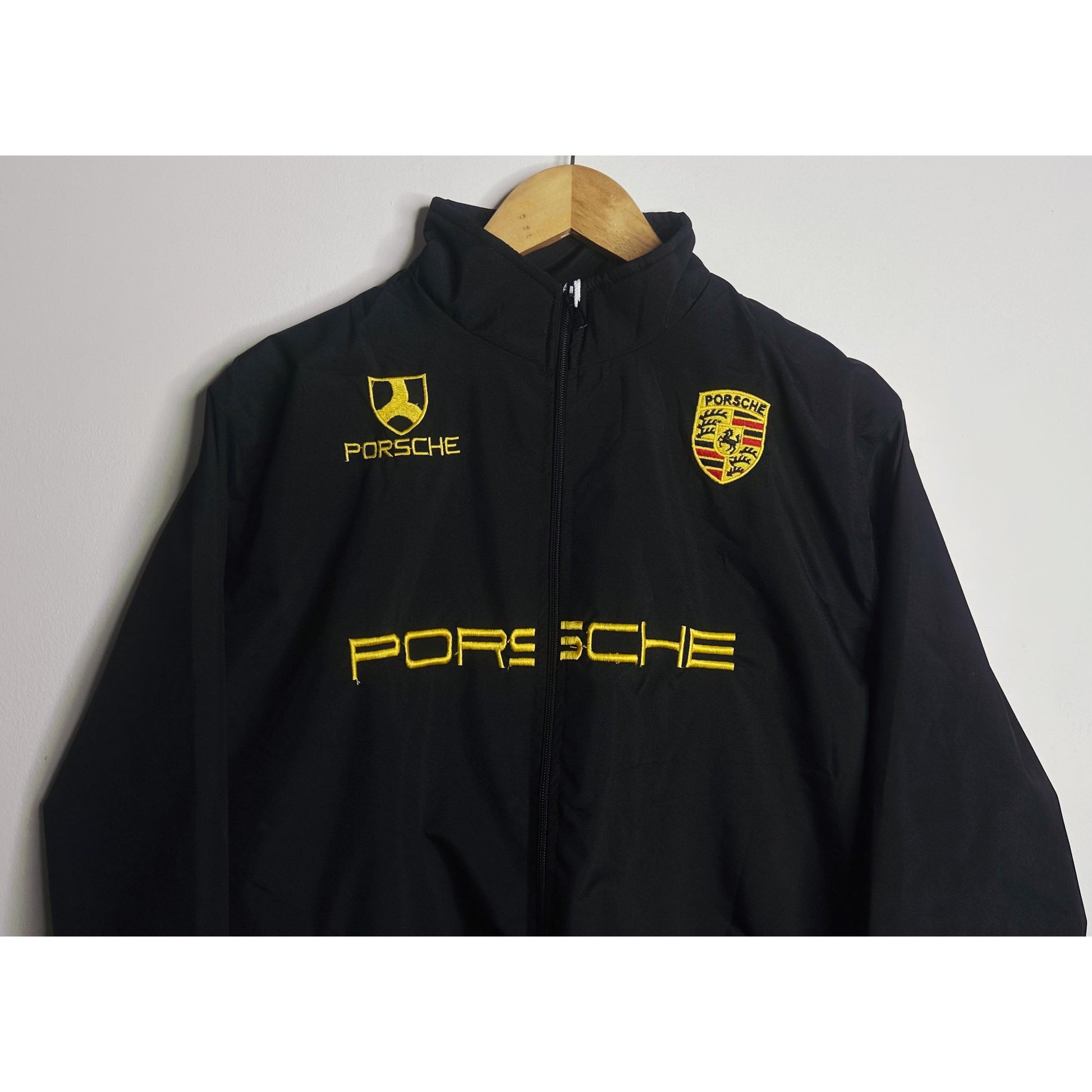 Upgrade your wardrobe with this Porsche Black Sports Jacket for Men, designed for performance, comfort, and iconic racing style. Made from premium-quality material, this full-zip black jacket features bold yellow Porsche embroideryon the front, including the Porsche logo and shield, giving it an authentic motorsport appeal.